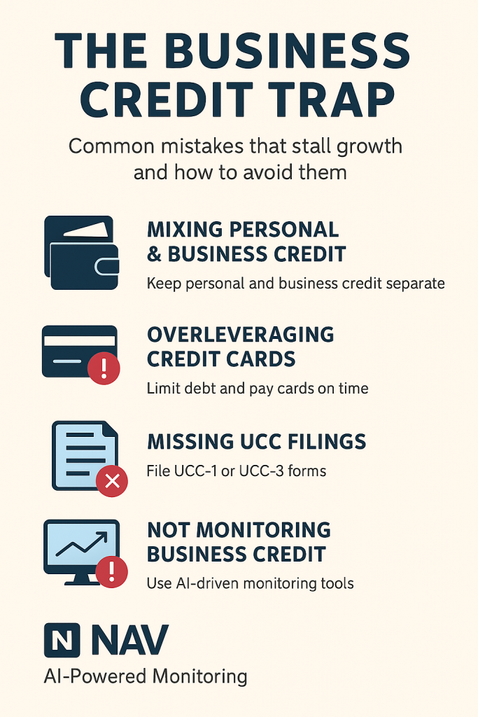 The business credit trap is not one big misstep. It is a series of small, often invisible mistakes that compound over time. Overleveraging cards, ignoring UCC filings, mixing personal and business credit, overlooking vendor reporting, failing to monitor scores, and neglecting cash flow are all avoidable pitfalls.
