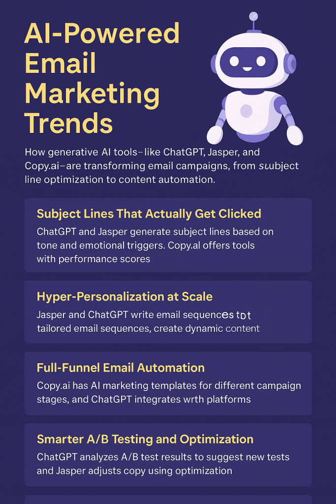 Email marketing is no dying; I is evolving. In fact, it is undergoing one of the most powerful transformations in years, thanks to generative AI. From writing high-converting copy to predicting user behavior, AI tools like ChatGPT, Jasper, and Copy.ai are not just improving email campaigns, they are redefining how they are built, delivered, and optimized.